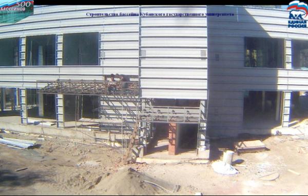 На сегодняшний день строительство бассейна в Кубанском государственном университете находится на завершающем этапе. Об этом рассказал на селекторном совещании, посвященном реализации партийного проекта «500 бассейнов», заместитель секретаря политического совета Краснодарского регионального отделения партии «Единая Россия» Николай Гриценко: «В данный момент возведение объекта идет по графику. Строители завершают покрытие, и само днище бассейна. 1 сентября на объекте появились монтажники оборудования, а это говорит о том, что к 15 октября основные работы будут закончены. Уже установлено около 50% сэндвич панелей, также почти готова вентиляция объекта. Остается лишь провести косметические работы».